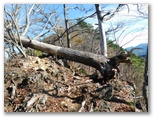大桑山頂を辞し、縦走路を下ります。かなり勾配があるのでスリップしないよう、気合を入れ直しました。下って行くと、立ち木を透かして、行く手の高畑山と倉岳山が見えてきます。その先で岩含みのゴツゴツした小峰に登り返すと、そこは本日のコースにおける貴重な展望地。好天のおかげもあって、道志の山並みと富士山とを望めました。この小峰には大きめの倒木があり、好展望と合わせて印象付けられます。昨年はここで地図を広げて、道志の山座同定をしました。