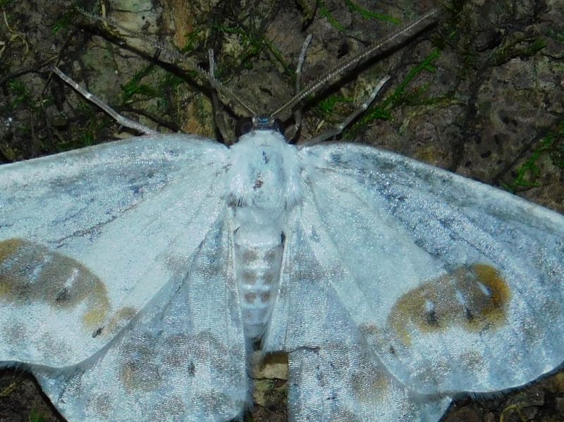 -- ヒトツメカギバの鱗粉がフラッシュ光を反射。
