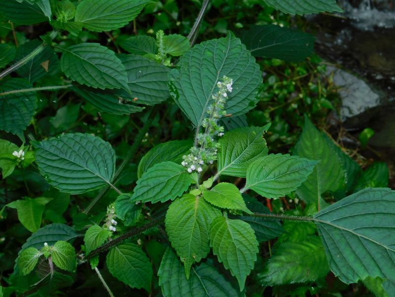 -- レモンエゴマの葉を手で揉む。