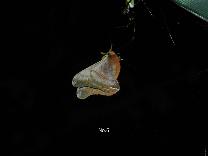 -- ヒメヤママユ No.6 手前上方のクモが、ウロウロしながら様子見。
