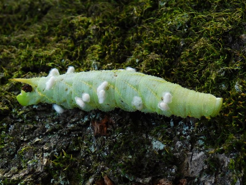-- スズメガの幼虫に寄生蜂の卵。右が頭。10:27
