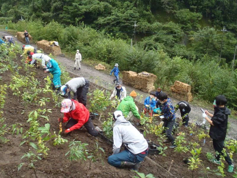 -- 瓦礫の山に苗木を植える。