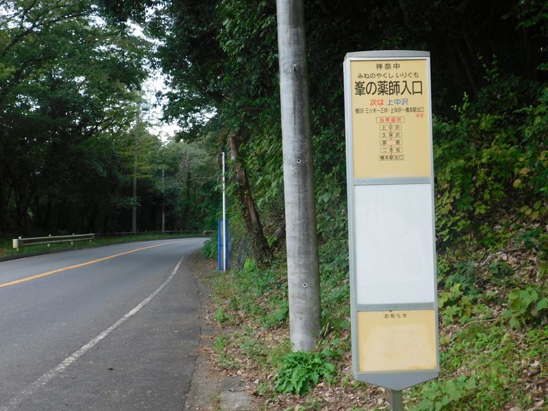 -- 峯の薬師入口バス停:次のバスは50分後。14:20