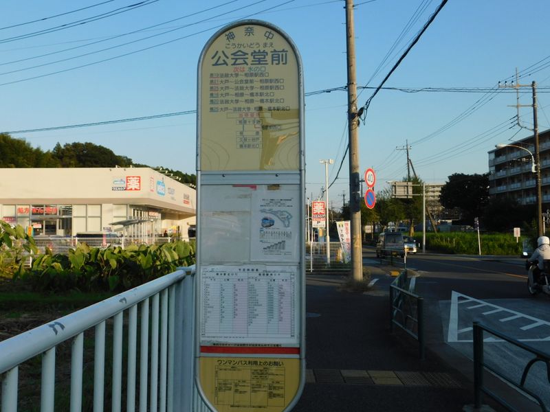 -- 公会堂前バス停。次の相原駅行は11分後。16:00