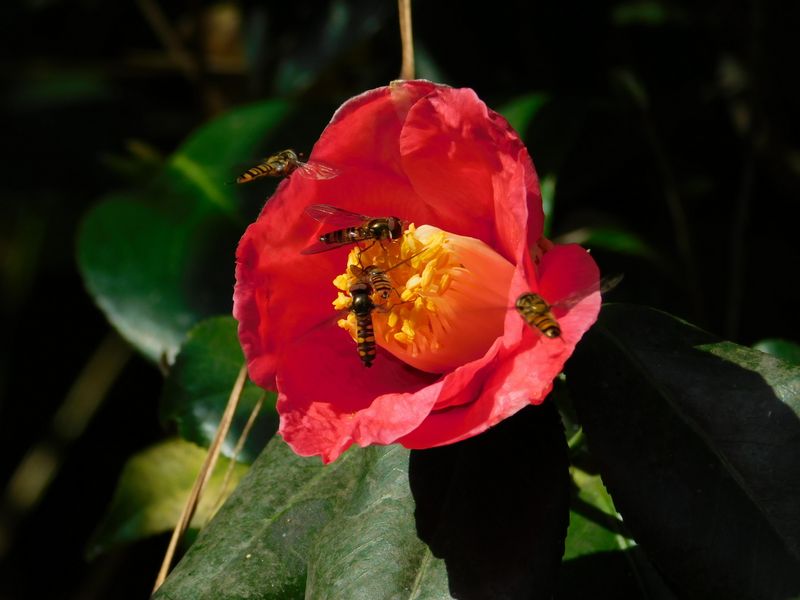 -- ヤブツバキとホソヒラタアブたち。