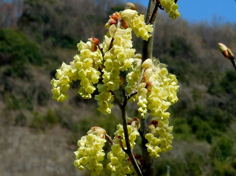-- 民家の庭のトサミズキ:高枝を見上げて。