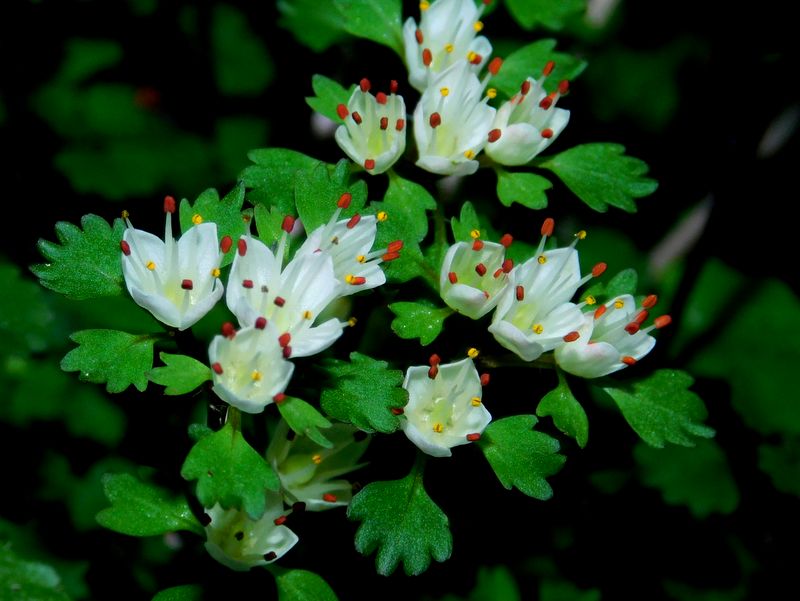 -- ハナネコノメ:赤い葯と黄色の葯。