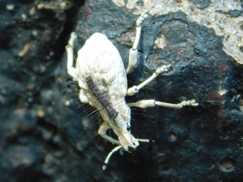 -- ヒメシロコブゾウムシの背に毛虫。