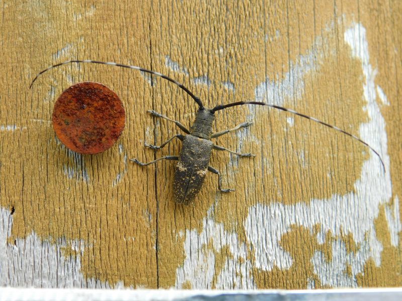 -- ヒメヒゲナガカミキリ:左の円は画鋲。