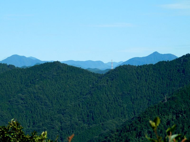 -- 高尾山駅前より望む、御前山(左)と大岳山。