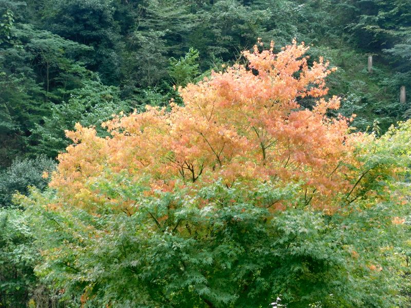 -- 植栽のモミジが色づき始めていた。