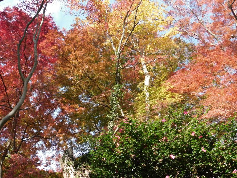 -- 仏舎利塔付近の紅葉とサザンカ。