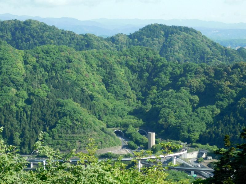 -- 高尾山駅前より、八王子城山(右)を望む。