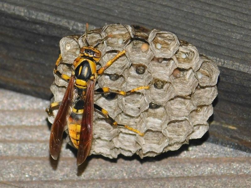 -- キアシナガバチの営巣:巣の中心部に幼虫。