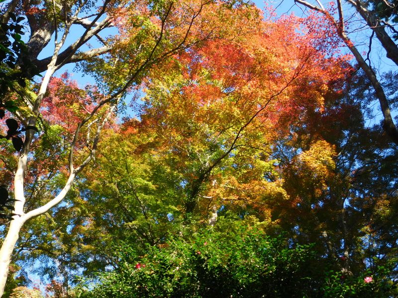 -- 有喜苑の紅葉とサザンカ。