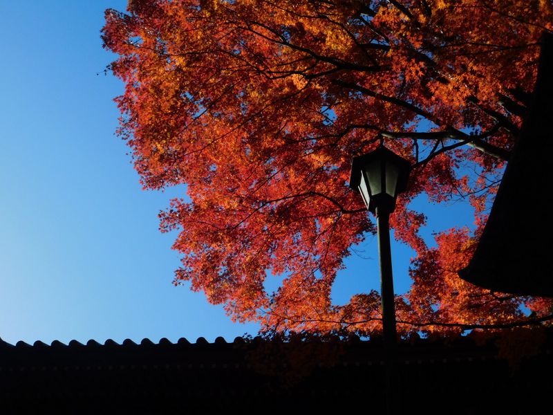 -- 薬王院山門わきの紅葉。9:47