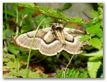 2025年4月26日(土) ◆きょうは、この春5回目の高尾山。イボタガに出遭える今年最後のチャンスだろうと思いながら、初電に乗る。車内にはハイカーたちの姿がちらほら。ゴールデンウィークの初日なのだ。◆いつもの三滝コースを巡る。そのはじめ、清滝と商店街とに思いのほか多種の蛾がいて、ケーブル清滝駅に着くまでに1時間以上を要した。◆6号路での出遭いは少なかった。光が弱くなったランプ、不点灯になったが街路灯が増えたからだろう。蛾さがしにとって、6号路の魅力は激減している。◆霞台と高尾山駅周辺では、期待を越える成果があった。そこで掲載は1種につき1枚だけとする(例外あり)。ハイカーも多く、浄心門でも山門でも、人の流れが途切れるのを待てなかったほど。◆イボタガは翅に古いクモの糸が絡み付いていた。だから出遭えたわけで、私としては大感謝。クモの糸を外し、繁みに隠してやる。すると、体を小刻みに震わせ始め、繁みを抜けて人目につくところに出てきた。再び手を差し出すと、手のひらに乗って震えるのをやめた。温度を感じるのだろう。この大きな蛾を手に乗せたまま、ウロウロ歩いて適当な場所を探していたら、木の幹の目立たない位置まで自ら飛んでくれた。◆蛾の名前についてお気づきの点がありましたら、ご教示ください。⇒こちらから ◎ 高尾山口駅 6:15 --- 7:20 清滝駅 7:26 --- 7:36 妙音橋 7:36 --- 7:54 琵琶滝水行道場 7:58 --- 8:20 霞台 8:48 --- 8:53 浄心門 8:53 ---(男坂)--- 9:10 薬王院 9:48 ---(女坂)--- 10:07 霞台 10:07 --- 10:29 琵琶滝水行道場 10:29 --- 11:07 蛇瀧橋 11:10 --- 11:14 高尾梅の郷まちの広場 11:16 --- 11:19 蛇滝口バス停 --- 高尾駅北口 全 5時間04分 単独 ❀❀❀❀ ❢