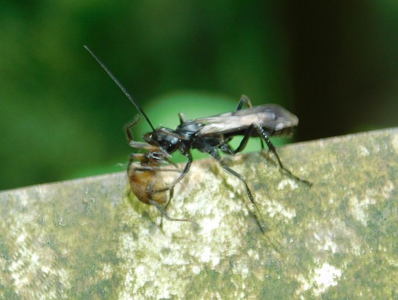 -- 捕らえたクモを運ぶ、オオシロフクモバチ。