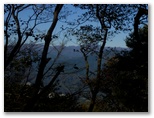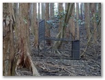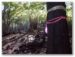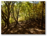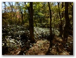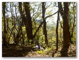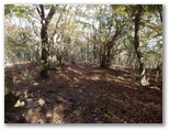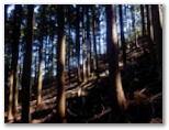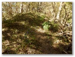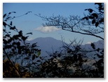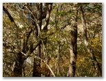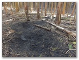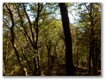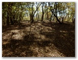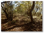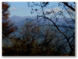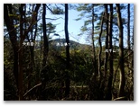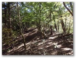 さて、その先を少し下ると、右に明るいカヤトがありました。松浦氏の「略図」に小さなカヤトが二つ示されていますが、そのいずれかでしょう。次は、平塚営林署の看板を見つけねばなりません。少し登って再び平坦地に出ると、木の間越しに鷹落場と鳥手山らしい峰を望めました。左遠方に頭の見えるのが、矢倉岳でしょう。しかしこの平坦地は倒木だらけで、とても人が歩くような場所らしくは見えません。果たしてここを進んでいいのでしょうか?