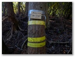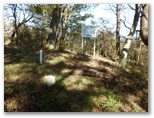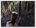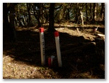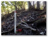 このとき11時5分、すでに予定時間を大きく超過したので、計画の変更を考え始めました。明るいうちに洒水の滝を見るには、遅くとも午後1時までには矢倉岳山頂を発たねばならないでしょう。それは、この先の径路の状況次第。とにかく前に進みます。鳥手山山頂から斜面を真っ直ぐに下り、右からの巻き道を合わせ、鞍部に至りました。標高は推定で603mほどです。短い黒杭、赤杭、コンクリート杭があり、ガラスの小瓶が転がっていました。この先は急登です。