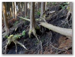 コンクリート林道の終点から、山道に入ります。はじめは道形が明瞭で、イノシシ(?)のヌタ場や足跡はありましたが、土を踏む喜びをもって進んで行きました。でもそれは10分も経たずに終わり、その先は踏み跡があるような、ないような、心許ない植林帯。ここにはかつて踏み跡があった、というバイアスをかけて見れば、踏み跡に見えなくもない、そんな斜面を慎重にトラバースして行きました。小規模ですが崩落地もあり、人にお奨めできるルートではありません。
