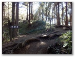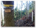 トラバースの先で尾根に至ると、「水源の森林No.13」の赤帽白杭がありました。尾根の向う側は急峻な谷です。この尾根を登って行くと、立ち木にピンク、紫、白、黄色などのテープが付いていました。大丈夫そうです。尾根を5分ほど登ると、赤帽白杭No.119と「水源協定林」の白い看板があり、丹沢方面に木の間越しの展望がありました。また私製の標識が二つあり、一つは谷峨駅を、他の一つは鳥手山(→)と洒水の滝(←)を指し示し、2017.1.21とありました。