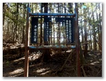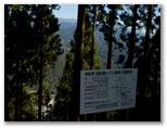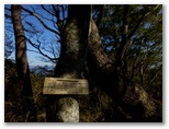 倒木帯を抜けて少し下ると、右手やや下方に、それらしいボロ看板の裏側が見えました。表側に回って見ると、きれいな字で「平塚営林署」と書かれています! ああ、よかった! これで、自分が正しいルートにいることは、100%確実です。そこから、ゆっくりと地面を踏みしめて登ること約25分、一つの小峰に達しました。立山(640m+)です。その先、5分ほどで、ようやく鳥手山に登頂しました。ああ、長かった! 展望はありません。立ったまま行動食を口に入れました。