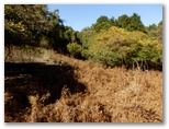 鷹落場から先には、道らしい道がありました。笹の繁る道など、走りたくなるほどです。そんな道を5分ほど軽快に進むと、のどかな雰囲気の広場がありました。車座でお弁当を食べるのに好さそうです。ここでは矢倉岳が正面、ほぼ真南に大きく見えました。道は南西方向に続き、右下には採石場が見え隠れします。矢倉岳が左手になり、さらに左後方にどんどん離れて行くので、あれあれ?と思いました。地図を見ると、この先で道は南東方向に急旋回するので、大丈夫です。