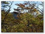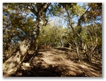 その鞍部から鷹落場山頂にかけて、急登を3度こなさねばなりませんでした。1度目は標高差約80m。まだ先が長いので、省エネモードで登って行きます。登り詰めた小丘では、樹々の隙間に富士山の頭を望めました。紅葉した木はありませんでしたが、黄色やオレンジ色になった葉が逆光でとてもきれいです。そして束の間の安息が終わると、2番目の急登は標高差約90m。踏み跡は相変らず不明瞭ですが、適当にアブラチャンの群生を縫いながら登って行きます。