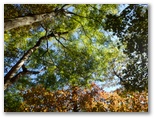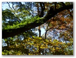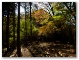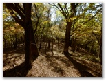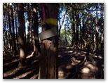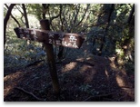 道はますます黄金色を帯びてきました。混交樹林の落ち葉によって、土は柔らかく、しかも傾斜は緩やか。歌でも歌いたい気分です。もう、踏み跡があっても無くてもかまいません。ひたすら尾根筋を進めば大丈夫。大きなヤマザクラの木が4本立つ地点を過ぎると、ついに矢倉岳を目の前に見るようになりました。そして、きょう初めての道標を裏側から見上げると直ぐ、見覚えのある山伏平に到着しました。このまま矢倉岳山頂まで一気に登ってしまいます。