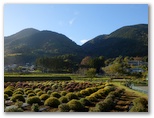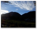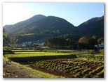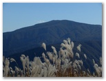 矢倉沢への道は、落ち葉でフカフカでした。スタコラ順調に下って、茶畑道の動物止めゲートを通過し、しっかりと閉じます。ここで丹沢をスッキリと眺めるのを楽しみにして来ました。そして思ったより早く、矢倉沢の里に到着。緩い谷戸の棚田では、ざる菊が見ごろ直前でした。畦道を彩る花は、白いミゾソバ、赤いソバ。山頂にいた、あの二人も下りてきました。矢倉岳は西日を受け、半逆光のシルエット。公民館の奥の、菊畑のベンチで、あと少しだけバスを待ちます。