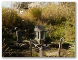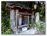 その尾根を登りきると、平坦地に出ました。右に行くべきか、左に行くべきか、見通しが悪いので判断しにくい箇所です。こんな時の私のルールは、まず正しくないと思う方向に進んで見て、正しくないことを確認し、引き返して正しい道に行くことです。ここでは右が正しいと思われたので、まず左に行って見ると、小さな石祠がありました。木漏れ日の当たり方を見て、違うという確証が得られたので、正しいと思った方向に進みました。畑沢分岐と呼ばれる辺りでしょう。