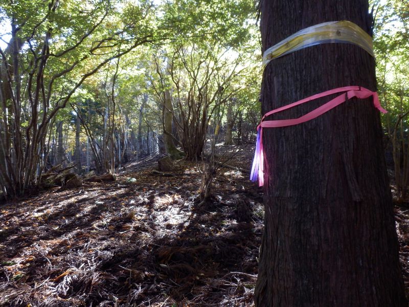 -- 尾根を登る。テープも味方、たぶん。9:56