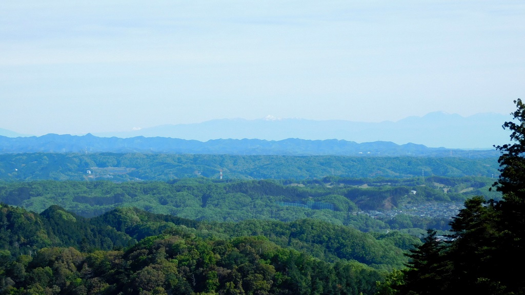 -- 都県境尾根(濃青シルエット)の彼方に、上州と日光の銀嶺。8:00