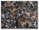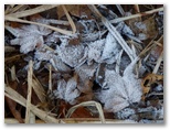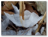展望を十分に楽しんだので、シモバシラを探しに行きます。展望台直下には、さすがにありませんでしたが、日陰の草むらを探すと、たくさん見つかりました。でも、ちょっと質感が異なります。来た道で見た氷花は、飴のように無数の白い線から成っていたのに対し、山頂のは透明感があり、ガラス細工のようです。少し溶けたのかもしれません。でもこれはこれで、また別の美しさがあります。このほか、土の下には霜柱が、地表の落ち葉には霜が見られました。
