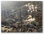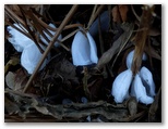 息が整ったところで、山頂に向かいます。キョロキョロ視線の先は、草の根っこ。もちろん、シモバシラの根っこ! しばらく行くと、簡単に見つかりました。一つ、二つ、三つ ... あるある! 登山道の右にも左にも、たくさんありました。高尾山のようにロープは張ってありません。うっかり踏まないように気を付けながら、カメラをネズミの目線くらいに下げて、マクロで撮影します。初めてこの氷花を見たときの感激は忘れません。今でも冬が来ると、ソワソワします。