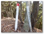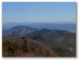 昼食を終え、南の尾根に向かいます。仏果山から、秋葉山分岐(馬渡分岐)と八州ヶ峰を経て、休憩所のある熊古谷山に至るまで、狭い尾根と好展望が続きます。ただ、これらの峰には山名標がなく、気が付かないうちに通過してしまうかもしれません。立派な山頂標が立っているのは、革籠石山(かわごいしやま:640m)。ここで木の根に腰を下ろし、お茶とみかんで小休止しました。その先、旧土山峠を含め、4ヶ所に休憩ベンチがありました。よく整備された登山道です。