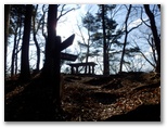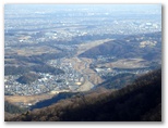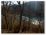 「水とエネルギー館」の開く10時まで待てないので、高取山に向かいます。相変わらず人の姿はありません。湖畔の登山口から、いきなり急勾配の階段が始まりました。長い区間ではありませんが、ふうふう喘ぎます。上で音がしたので見上げると、鹿が立って私を見ていました。そして私が銃を持っていないと知ったのか、悠々と立ち去りました。ようやく階段が終わり、休憩所に到着。宮ヶ瀬ダムを見下ろせる、すばらしい展望地です。これはもう、休むしかありません。