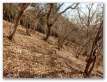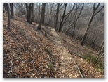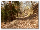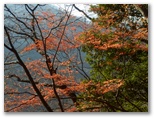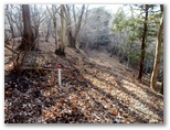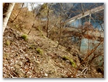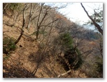 もし採石場に入ってしまったら、何と言おう? でも無事にどこかに出られたら、山の友たちを誘って歩きたい、それは新緑か紅葉の季節がいいな、などと考えながら歩きました。一部きれいな紅葉の残っているところもありました。そして道が緩い下り坂に転じ、尾根や谷を巻いて、左の宮ケ瀬湖の方向へと方向転換すると、道が突然なくなっていました。いや、宮ヶ瀬湖に落ちていたのです。もう進めません。左のザレた斜面に逃げました。でも滑落すればドボンです。