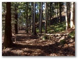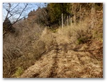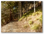 旧土山峠には、軽四が入っていました。ここに来ているということは、みやがせ道のゲートを通過できる車両なのでしょう。私は旧土山峠のすぐ東、登山道がみやがせ道と出合う地点で右折し、みやがせ道北西部の探索に向かいました。これは本日のサブミッション。この道は、どこまで行けるのでしょうか? 等高線に沿って緩やかにカーブする、幅広でほぼ水平の道。はじめは轍のある草道でしたが、すぐに杉林になりました。古道のような趣のある、快適な道が続きます。