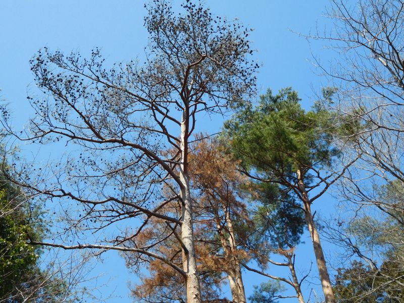 -- 松ぼっくりをたくさん着けて枯れたアカマツ。12:08