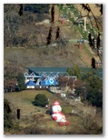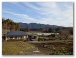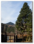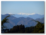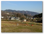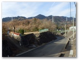 三ケ木行きのバスは、津久井高校の生徒たちを次々と乗せて行きました。終点三ケ木に到着すると、国道412号と413号の共通区間を、青山方面に進みます。右の畑地の彼方に、すっくと立つ権現山の姿が印象的。「ほう!」と見直しました。童人夢農場の看板から右手のわき道に入り、聖徳太子塔を左に見ながら、道なりに時計方向に旋回して行きます。少し広い車道と合流し、その道を旧水道沈殿池の方向へ緩く下って行くと、前方に目指す高塚山と石老山を望めました。