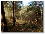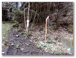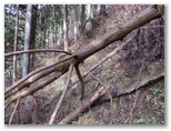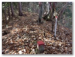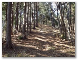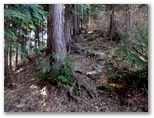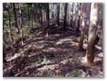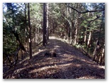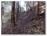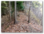 斜面には、たくさんの間伐材が水平に転がっていて、ちょうど階段の土止めみたいに、好い足場になっていました。ただ細かいトゲのある植物が繁っていて、チクチクと衣服に引っかかります。かなり手間取りましたが、体力を消耗することはなく、東尾根に乗ることができました。見たところ、尾根道は結構歩かれているようです。嫌なトゲの植物もなく、スイスイ歩けました。右手から、554m峰を擁する別の尾根が迫って来ています。