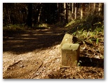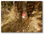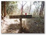東尾根の傾斜が強くなり、杉や檜の植林を登って行くと、頭に赤ペンキの塗られた、一見すると三角点のような石柱がありました。これは林野庁の境界見出標で、これより石老山の先まで点々と設置されていました。東尾根に道標は見られませんでしたが、この赤帽の石柱が道案内になるかも知れません。でも、何の境界でしょうか? と思う間もなく、ひょっこりと山頂に到着しました。