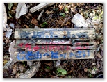 高塚山に展望はありませんでした。三等三角点がありますが、過去にはいくらか見晴らしがあったのでしょう。ボロボロに朽ちた標識があったので、破片を集めて復元してみると、「高塚山 山頂、これより先行止まり、石老山へ戻り下さい」と読めました。ベンチなどないので、立ったままお茶とパンの休憩にします。堂々たる山容の石老山の横にいつもあって、近隣の山々から見るたびにちょっぴり気がかりだった高塚山。今その山頂で熱いお茶をフーフーと吹いています。