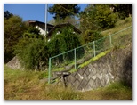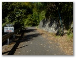 この林道を左に進むとすぐに、左手の空間が開け、蕨山方面を先ほどよりもいい感じで望めました。ガードレールに白い案内板があり、「天狗岩―武川岳」の文字と、赤い「⇒」が描かれています。その傍らに枇杷の木があって、ふっくら柔らかそうな花芽がたくさん着いていました。そして「⇒」の指すところには、青い手すりの付いた石段No.3があって、法面を難なく登れるようになっています。ここでリュックを下ろし、念入りに準備運動を行いました。
