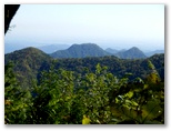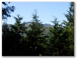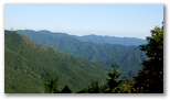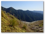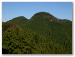 さらに3分ほど行くと、右上に昇る石段No.1がありました。緑色のフェンスと「天狗岩・武川岳」と書かれた道標があります。この石段No.1を昇りきると、また林道に出ました。この林道を登って行くと、次第に眺めがよくなり、開けた場所から振り返ると、蕨山方面を望めました。ついカメラを向けてしまいますが、後にもっと優れた展望地があります。この林道を約10分ほど登ると、左に玉石とコンクリートの石段No.2が現れました。ここが武川岳の登山口のようです。