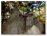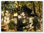 きょう予定したルートでは、この採掘場上から二子山雌岳まで、ずっと尾根歩きです。その尾根には、さっそく石灰岩の露出が見られました。人の顔や動物の姿に似た岩もあって、少し楽しめます。登山道は稜線の少し左寄りに付けられているので、まだ岩の上を歩く必要はありません。こんな尾根を正味10分ほど歩いたころ、天狗岩直下に至り、そこが男坂・女坂の分岐点になっていました。私は岩稜を直登する男坂に進んだのですが、女坂はどこを通るのでしょうか?