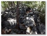 右上方に注意しながらトラバース道を進むと、大小の角張った石灰岩がゴロゴロ落ちている箇所がありました。おそらく稜線ギリギリまで発破をかけて採掘するのでしょう。やがて標高710mあたりでその稜線に立つと、採掘場を俯瞰することができました。ここ武川岳南稜で、最も展望の利く場所です。近くには古御岳や高畑山、遠くには奥武蔵南東部の山なみを望めました。奥武蔵には、武甲山を筆頭に、石灰岩の採掘場がいくつもあって、山の形を大きく変えています。