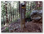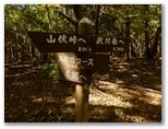 石段No.2のわきに、小さな道標があり、「武川岳・天狗岩方面」と書かれているのを確認します。石段No.2は16段ほどしかありませんが、登り切ったところに小さな平地があり、色づき始めたモミジが歓迎してくれました。体が十分に暖まったので、上着を脱ぎ、夏山スタイルになります。冷たいお茶を一口飲み、山道に入りました。フィトンチッドの香りに満ちた杉林です。ルンルン気分で登って行ったら、10分も登らないうちに、また別の林道に飛び出しました。